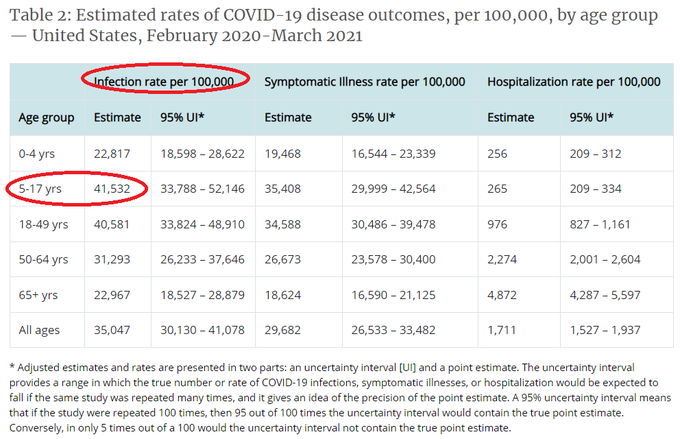 And there's this. Whatever we were doing to kids all year sure didn't work if you believe the CDC, which estimated that children had the highest infection rate of any age group, with over 41% infected by March 2021.