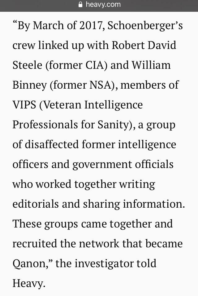 “By March of 2017, Schoenberger’s crew linked up with Robert David Steele (former CIA) and William Binney (former NSA), members of VIPS (Veteran Intelligence Professionals for Sanity), a group of disaffected former intelligence officers and government officials who…