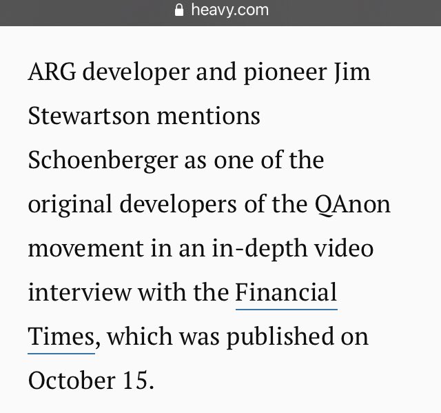 ARG developer and pioneer Jim Stewartson mentions Schoenberger as one of the original developers of the QAnon movement in an in-depth video interview with the Financial Times, which was published on October 15.