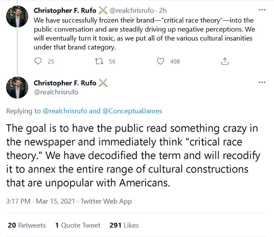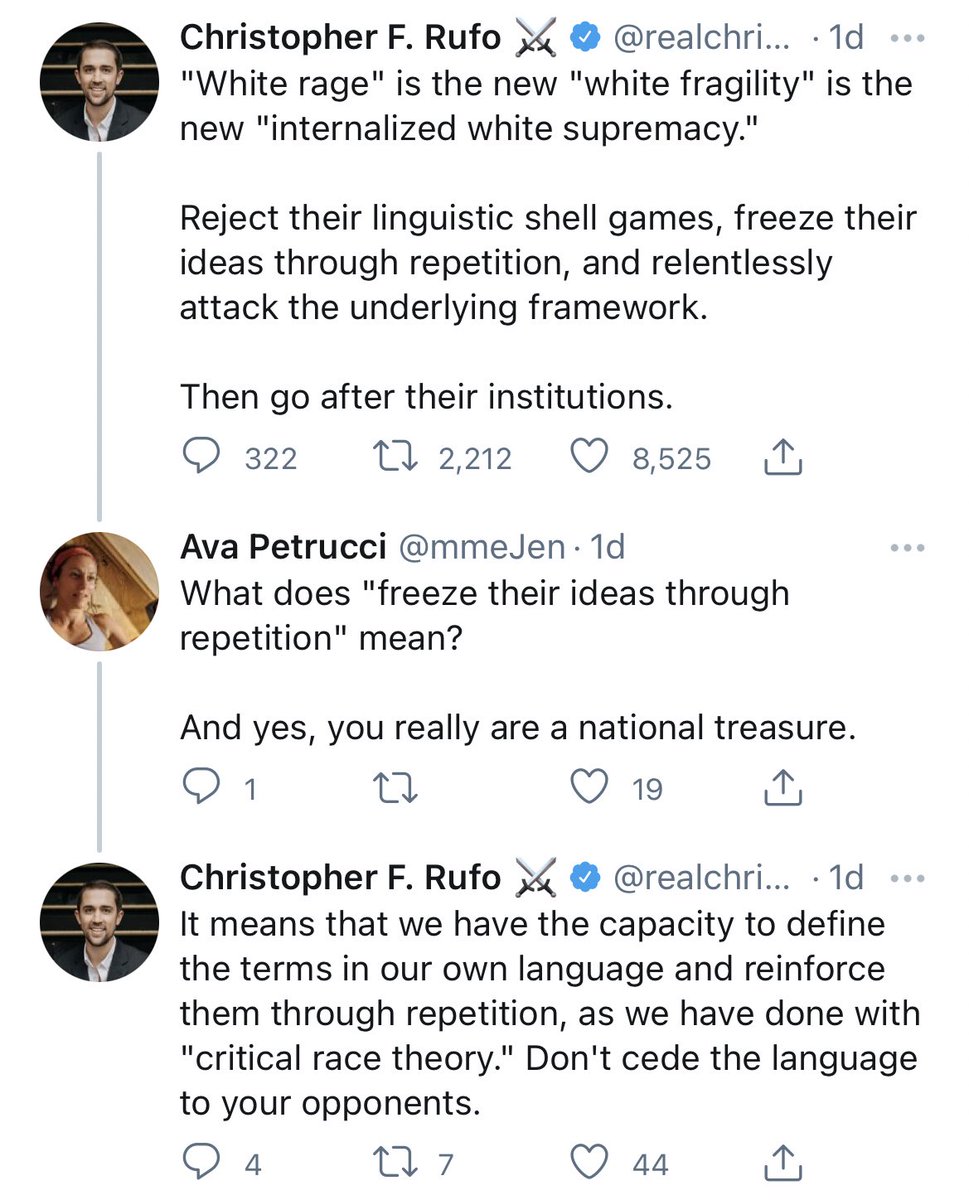 Here is a good set of tweets where Rufo openly admits his disregard for truth and strategy of bad faith manipulation of language. Can we stop taking him seriously now, media? Please?