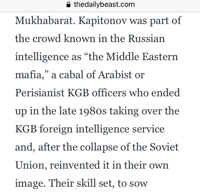 Kapitonov was part of a group known in Russian intelligence as “the Middle Eastern mafia,” a cabal of Arabist or Perisianist KGB officers who in the late 1980s took over the KGB foreign intelligence service and, after the collapse of the Soviet Union, reinvented it in their image