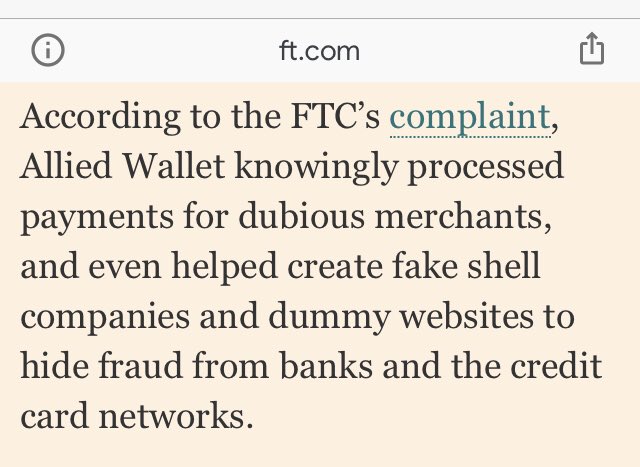 According to the FTC’s complaint, Allied Wallet knowingly processed payments for dubious merchants, and even helped create fake shell companies and dummy websites to hide fraud from banks and the credit card networks.