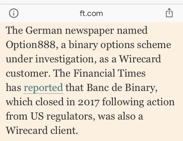 The German newspaper named Option888, a binary options scheme under investigation, as a Wirecard customer. The Financial Times has reported that Banc de Binary, which closed in 2017 following action from US regulators, was also a Wirecard client.