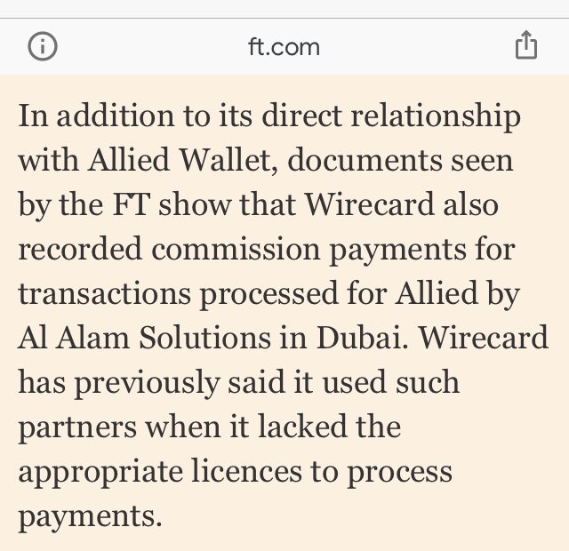 In addition to its direct relationship with Allied Wallet, documents seen by the FT show that Wirecard also recorded commission payments for transactions processed for Allied by Al Alam Solutions in Dubai.
