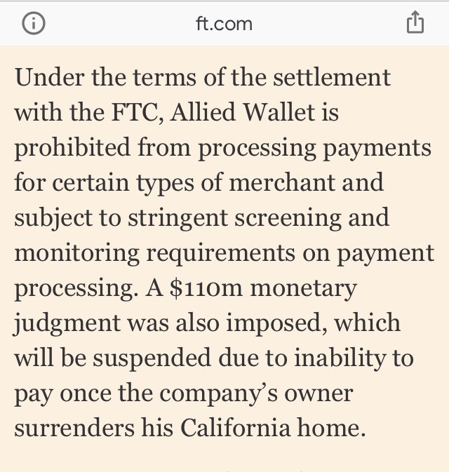 Under the terms of the settlement with the FTC, Allied Wallet is prohibited from processing payments for certain types of merchant and subject to stringent screening and monitoring requirements on payment processing.