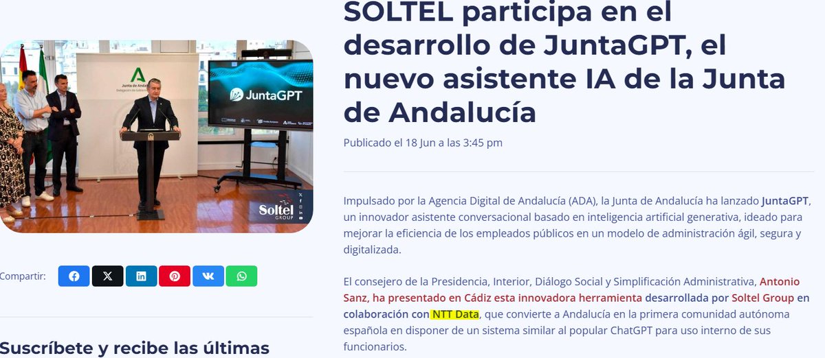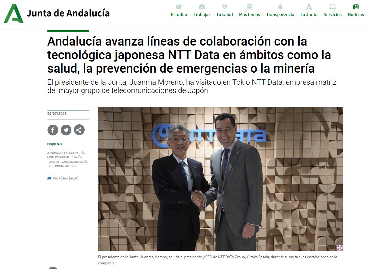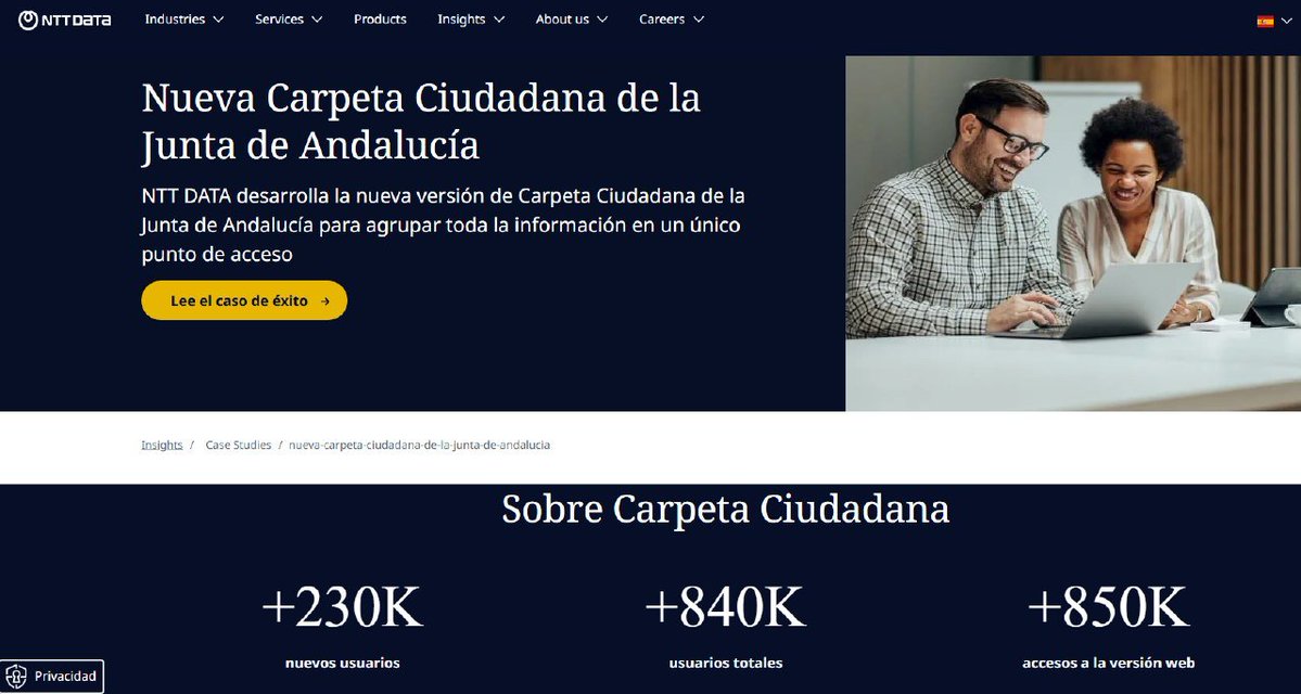 En la web de la Junta podemos encontrar el vídeo de la visita de Moreno Bonilla y su equipo a la sede de NTT Data donde dice que son los responsables del portal de la Junta de Andalucía, la Carpeta Ciudadana, Click Salud y el mantenimiento de los historiales clínicos.