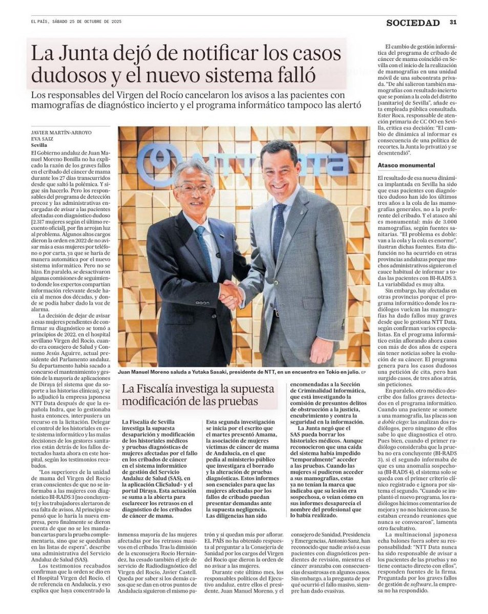 Varios medios publicaron que el origen de los fallos del cribado de cáncer fue la empresa NTT Data. Pero ningún medio mencionó que su presidente hasta 2014 fue Eduardo Serra, exministro de defensa de Aznar. Esta empresa tiene cientos de millones en contrato con la Junta. Va hilo.