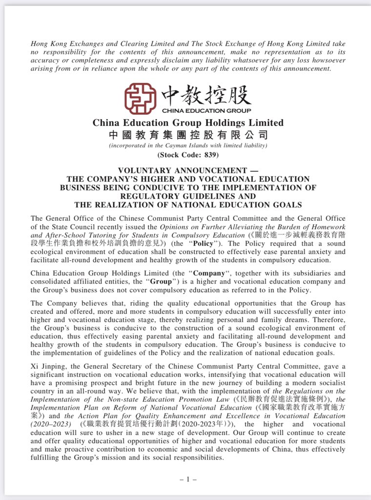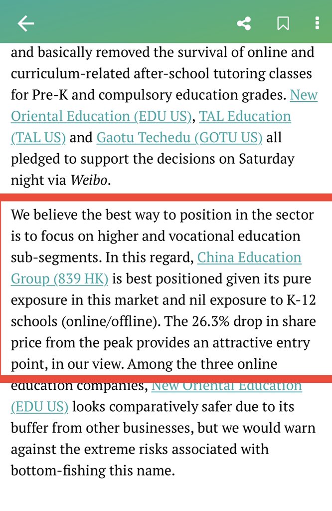 China Education: Time to put baby back in the bath water? Brick & mortar, tertiary / vocational education stocks also hammered despite no -ve policy implications. Now big guys are batting on the front foot. See o/n from $839.HK China Education Group www1.hkexnews.hk/listedco/listc…