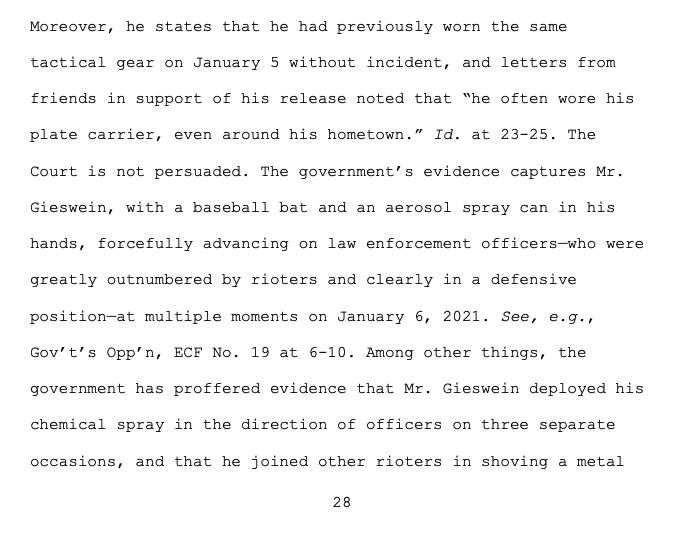 Judge Emmet Sullivan: "The government’s evidence captures Mr. Gieswein, with a baseball bat and an aerosol spray can in his hands, forcefully advancing on law enforcement officers—who were greatly outnumbered by rioters and clearly in a defensive position—at multiple moments"