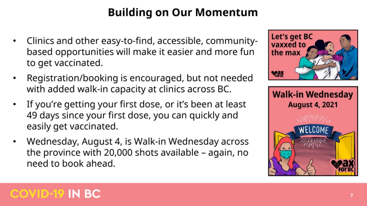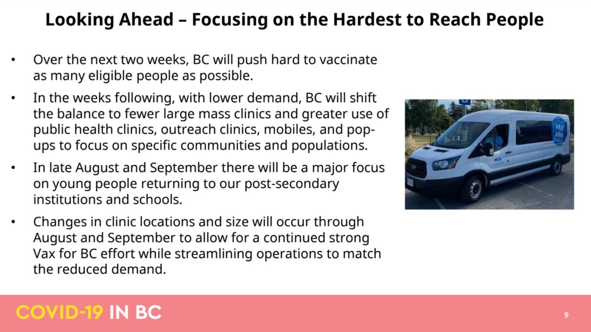 In the next few weeks, B.C. will shift from mass clinics to smaller public health clinics, outreach sites, mobile stations and pop-up clinics to target specific communities. Province will also focus on young people returning to school in late August/September.