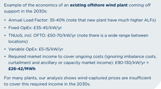 The most eye-catching finding for me is that offshore wind farms and onshore ones in Scotland (that’s a lot of them) are likely to be uneconomic when they reach the end of their existing subsidy contracts, primarily from the 2030s, and could then close