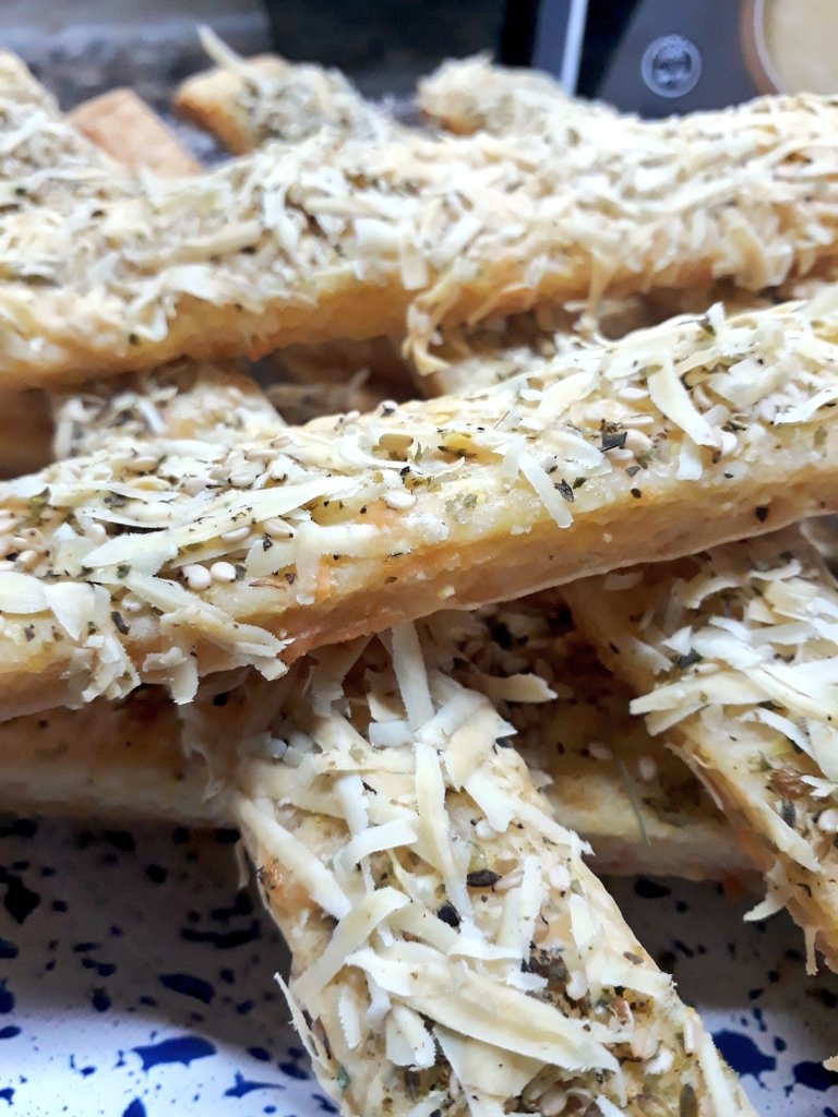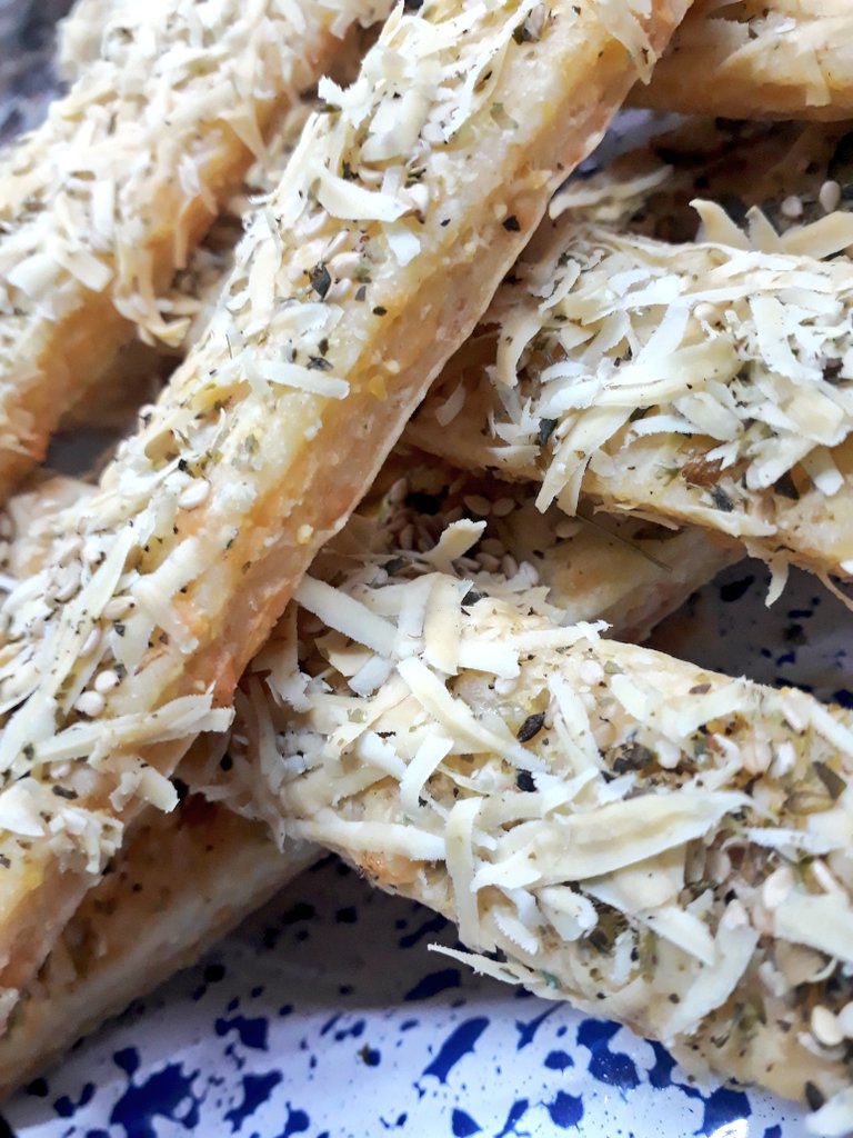 Estirar la masa y cortar tiras del tamaño que quieras. Punta con aceite y cubrí con lo que más te guste, más queso, ajo, perejil, semillas.
