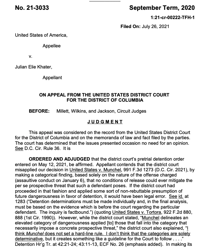 Julian Khater, one of two men charged with conspiring to assault Officer Brian Sicknick at the Capitol with a chemical spray, will remain in jail — the DC Circuit rejected his appeal of a judge's detention order. No ruling yet in co-def George Tanios' case s3.documentcloud.org/documents/2101…