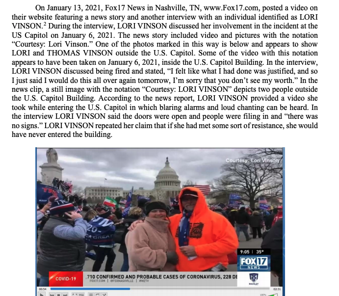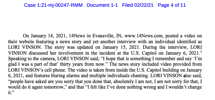 Feds note Lori Vinson told an interviewer: "people have asked are you sorry that you done that, absolutely I am not, I am not sorry for that, I would do it again tomorrow"