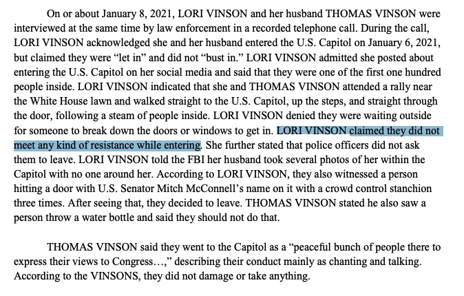 A common theme we've seen in misdemeanor cases like the Vinsons is this idea that they didn't encounter police telling them they couldn't go inside the Capitol. The officers appearing before Congress now are describing how they were outnumbered/overwhelmed by the violent mob