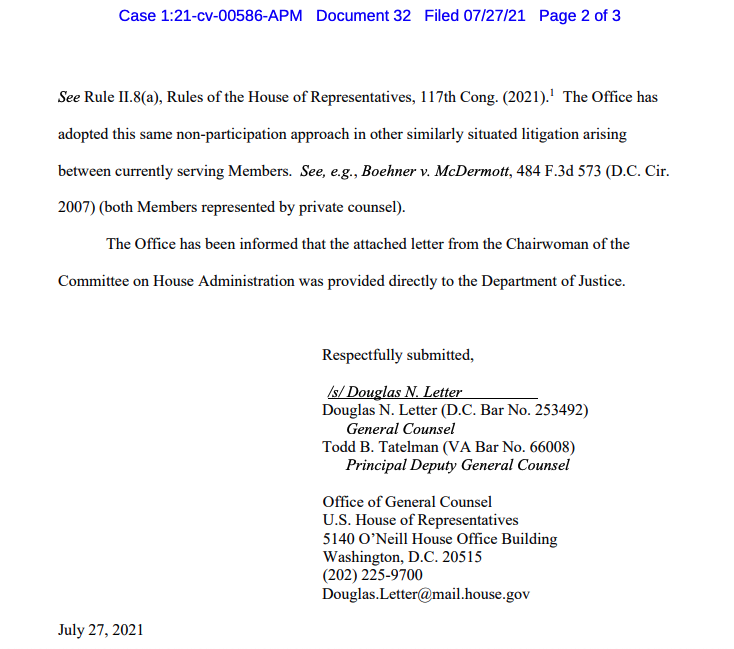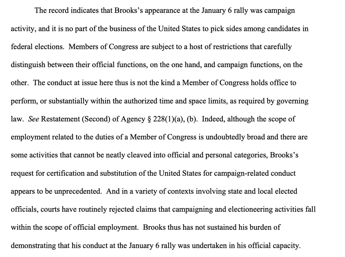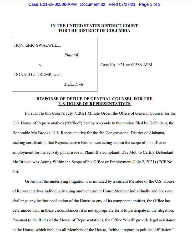 In response to Rep. Mo Brooks seeking to have the US govt substituted as a defendant in Rep. Swalwell's Jan. 6 lawsuit — arguing he was acting within scope of employment — House GC says it won't participate, and disputes Brooks' theory to DOJ s3.documentcloud.org/documents/2101…