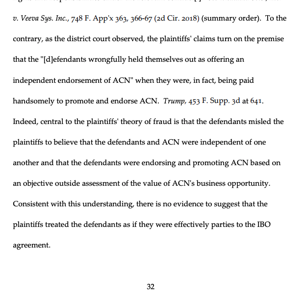 ...fast forward, aggrieved investors sue ACN and Trump. Trump tried to invoke an arbitration clause in the contract investors signed with ACN, but the district judge (and now 2nd Circuit) said nope b/c a big part of the case is that customers didn't know Trump was in biz with ACN