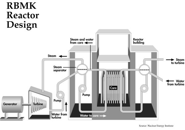 Los reactores de la planta nuclear de Chernobyl son de tipo RBMK-1000, que significa Reactor de Condensador de Alta Potencia, fabricados única y exclusivamente para la URSS, con capacidad de producir Plutonio de grado armamento y 1000 mega vatios c/u. Hoy en día son obsoletos.