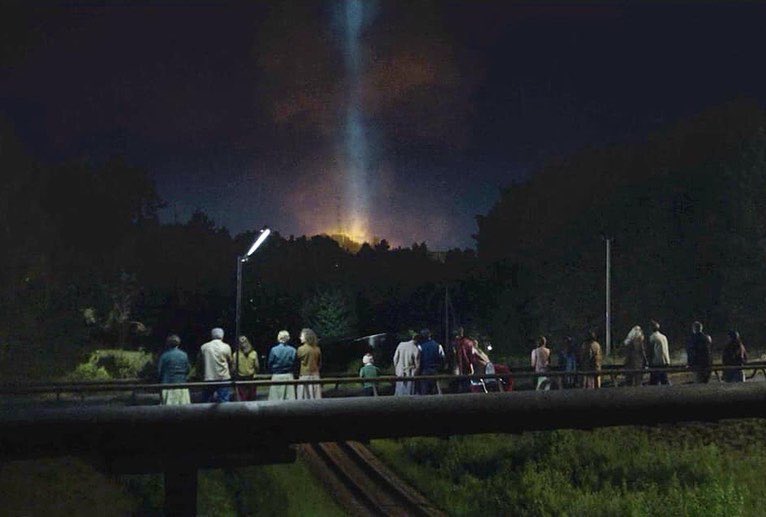 Esta imagen que sale en la serie, el rayo de luz, se llama Efecto Cherenkov (nunca pasó) se produce cuando en medios transparentes y densos como el agua, cuando las partículas cargadas viajan más rápido que la luz. Tampoco se ve en el cielo en forma de columnas.