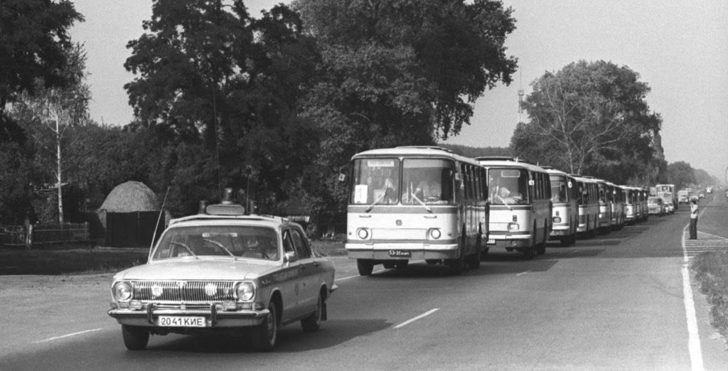 A las 36 horas después del alba, evacuaron a más de 300.000 personas, comenzando por Pripyat y sus alrededores y de un radio de 30 kilómetros a la redonda. 1.100 buses de Kiev llegaron a Pripyat y a las 5 de la tarde, la ciudad era un pueblo fantasma.