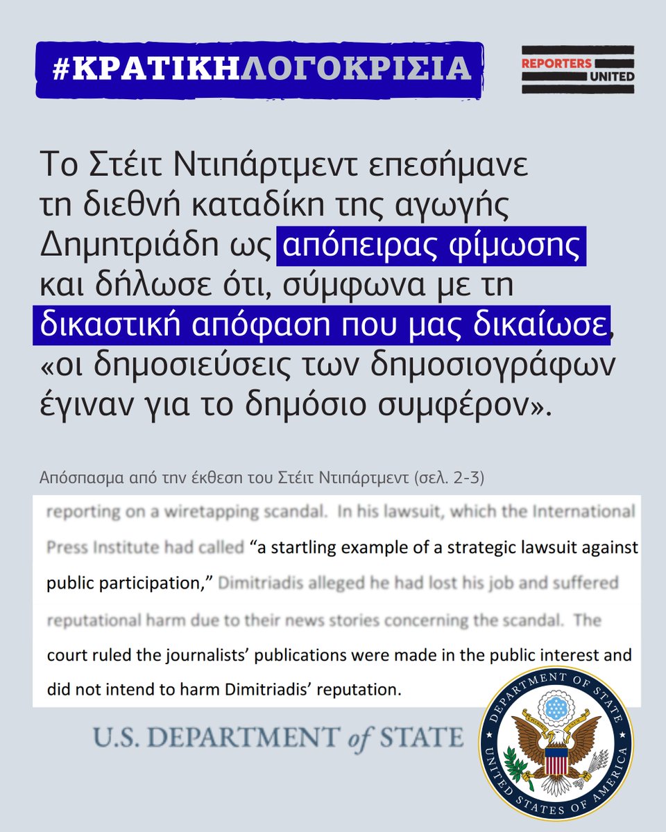3⃣ Στην έκθεσή του το Στέιτ Ντιπάρτμεντ επεσήμανε τη διεθνή καταδίκη της αγωγής #Δημητριάδη ως απόπειρας φίμωσης και δήλωσε ότι, σύμφωνα με τη δικαστική απόφαση που μας δικαίωσε, «οι δημοσιεύσεις των δημοσιογράφων έγιναν για το δημόσιο συμφέρον».