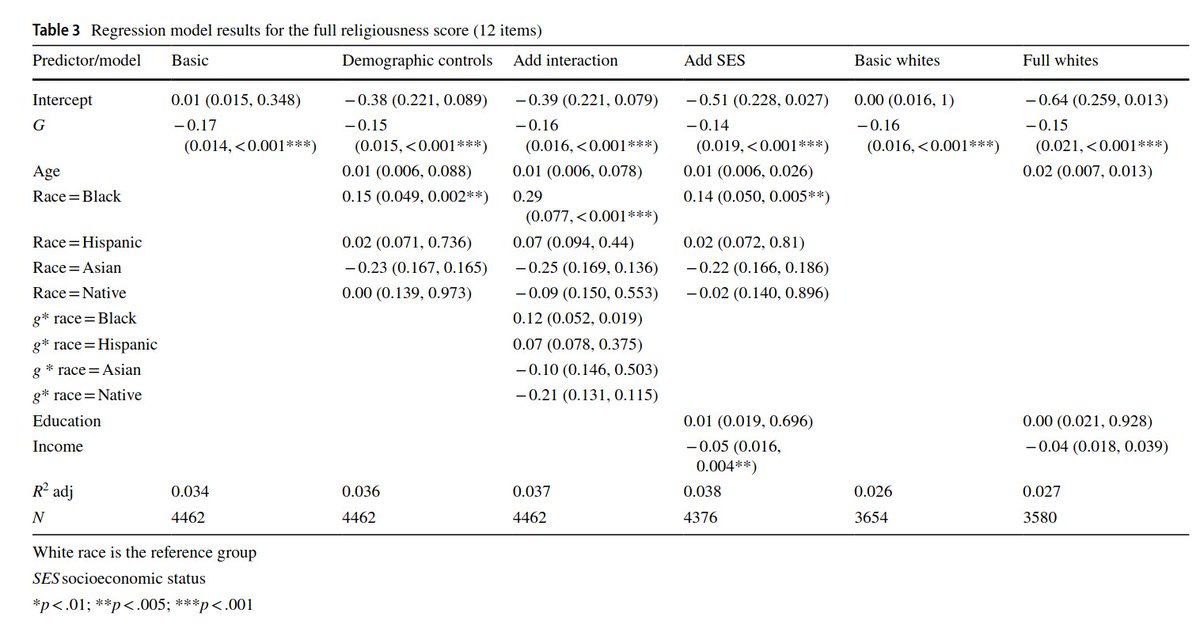 Factor analyzing the religious items yields a kind of semi-continuous religiousness latent variable. This is related to intelligence at -0.20 ish.