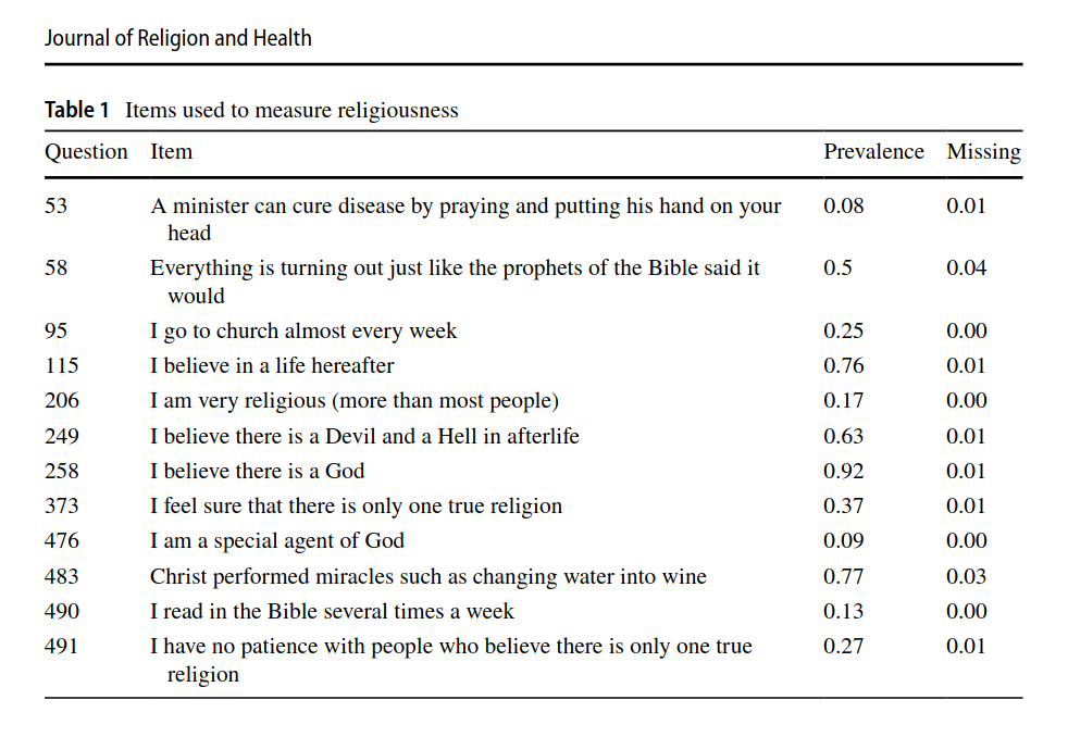 We use data from the awesome Vietnam Experience Study (VES) which has 19 cognitive tests, and all the MMPI-2 items, many of which ask about religious matters.