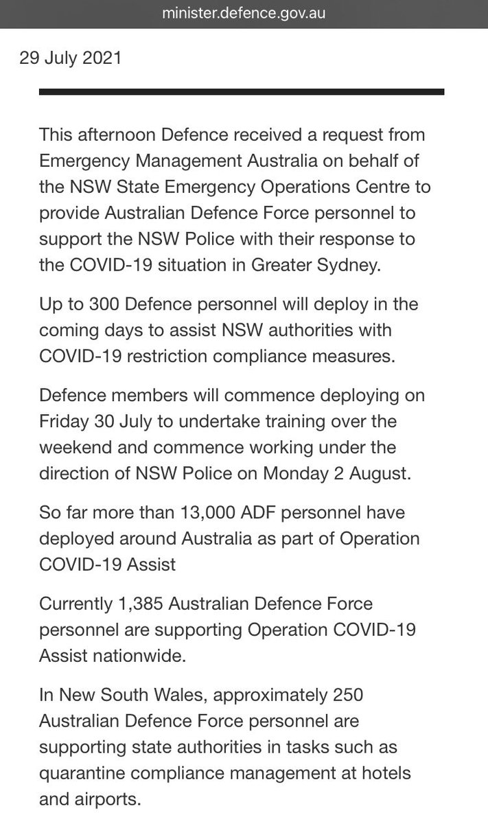 there is no detail anywhere on what the soldiers are being deployed to do, let alone by what authority. Use of force (presumably not)? Build temporary iso accommodation for essential workers from crowded homes (lmao fuck no of course not). Just wall to wall Liberal Party comms.