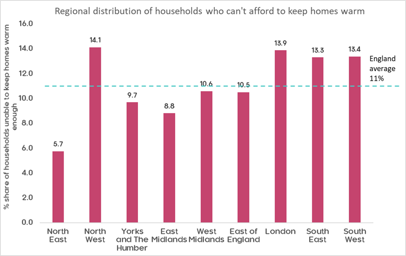 Among all households who couldn’t afford to keep homes warm in England, a greater share of them were in the North East (14.1%) and London (13.9%) compared to the average share in England (11%). 4/6