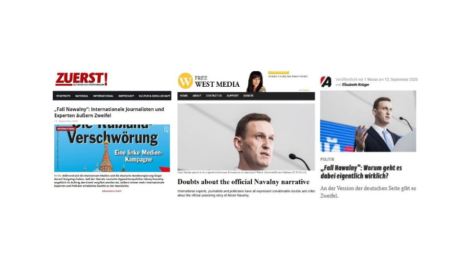Numerous similarities existed between the articles, reflecting crude copy & paste efforts. The opening of 2 articles contained "Navalny had been flown on 22 August with poisoning symptoms from Russia for medical treatment to Berlin" & the article structures were near identical