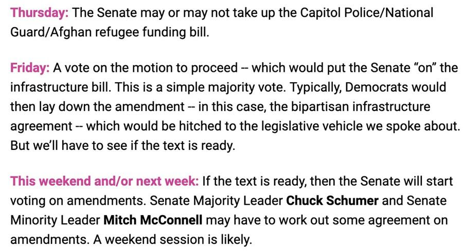 @JoeBiden@PunchbowlNews@Sen_JoeManchin@SenatorSinema@SenatorTester@SenatorHassan@SenMarkKelly We still have to see what order Schumer will bring legislation to the floor. Do Democrats bring up the bipartisan infrastructure deal for a vote first, if and when it’s ready, and then the budget resolution? We believe that’s the likely scenario, but Schumer will have to decide.