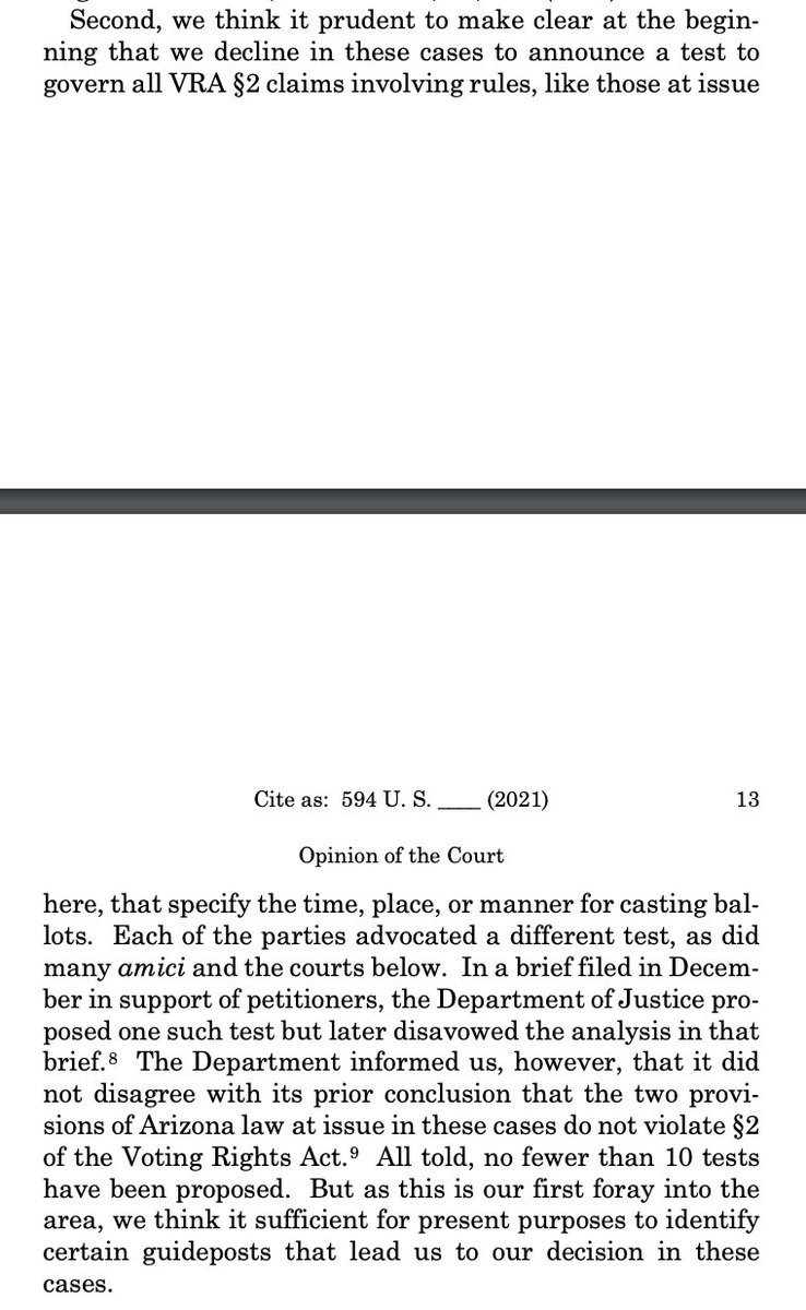 Important from the majority: The Supreme Court "decline[s] in these cases to announce a test to govern all VRA §2 claims involving rules, like those at issue here, that specify the time, place, or manner for casting ballots."