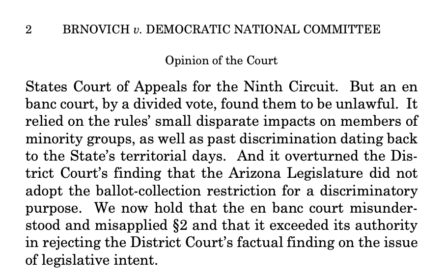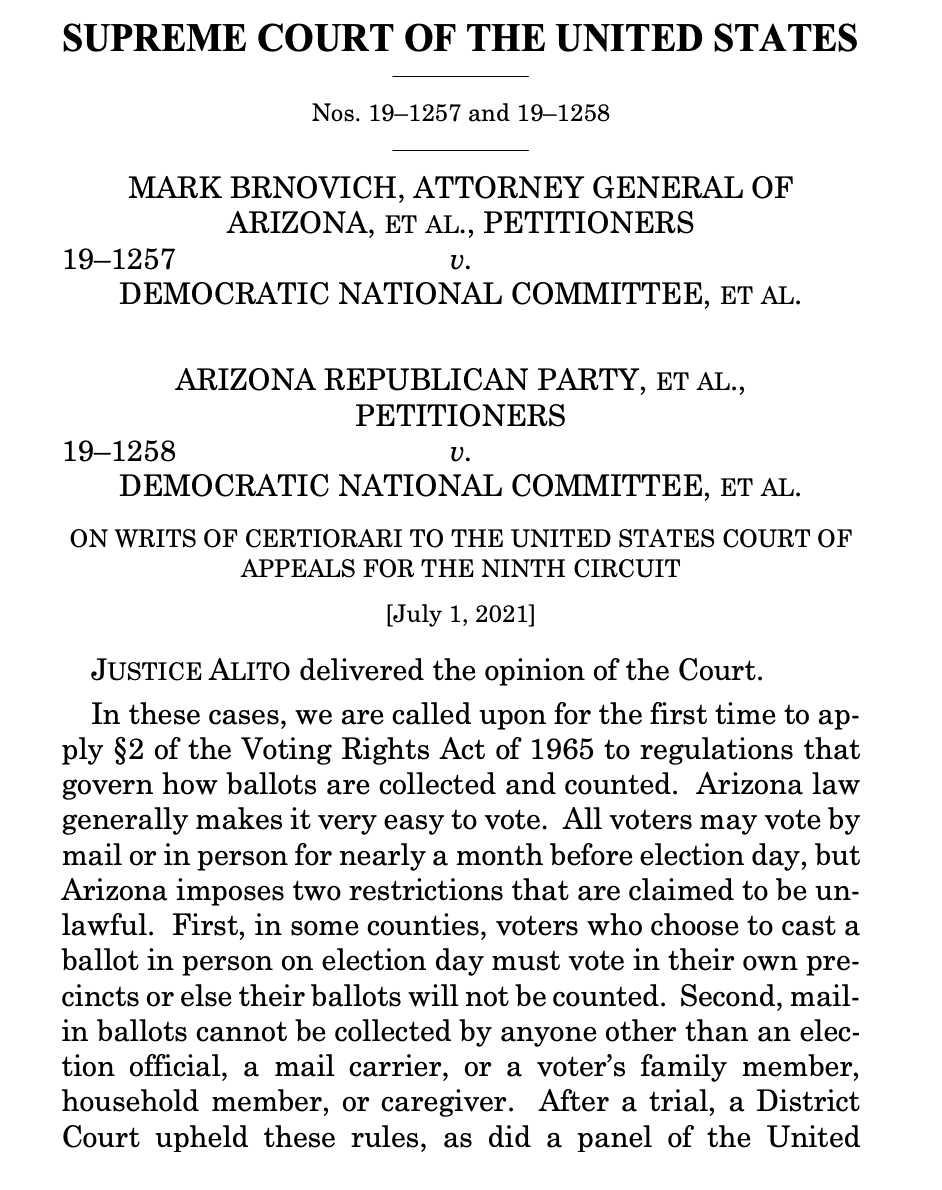 BREAKING: Brnovich is first. Alito, for a 6-3 court, upholds both Arizona voting restrictions. More to come. supremecourt.gov/opinions/20pdf…