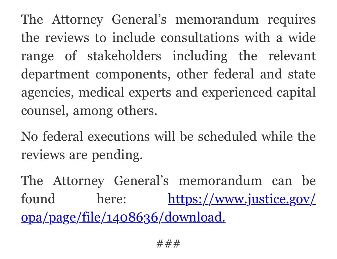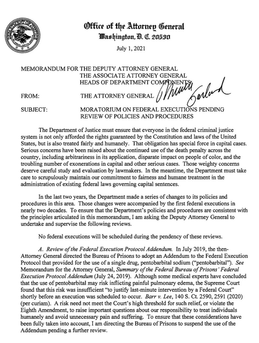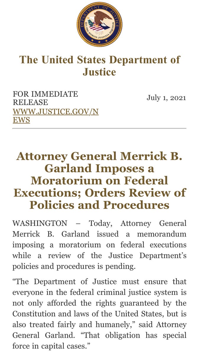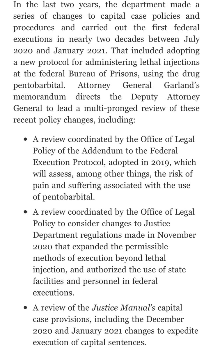On the Garland death penalty actions tonight: The steps being taken here are good, but woefully incomplete and not-unlike the Obama-era actions that ultimately led nowhere and allowed Trump and Barr (and then Rosen) to put 13 people to death.