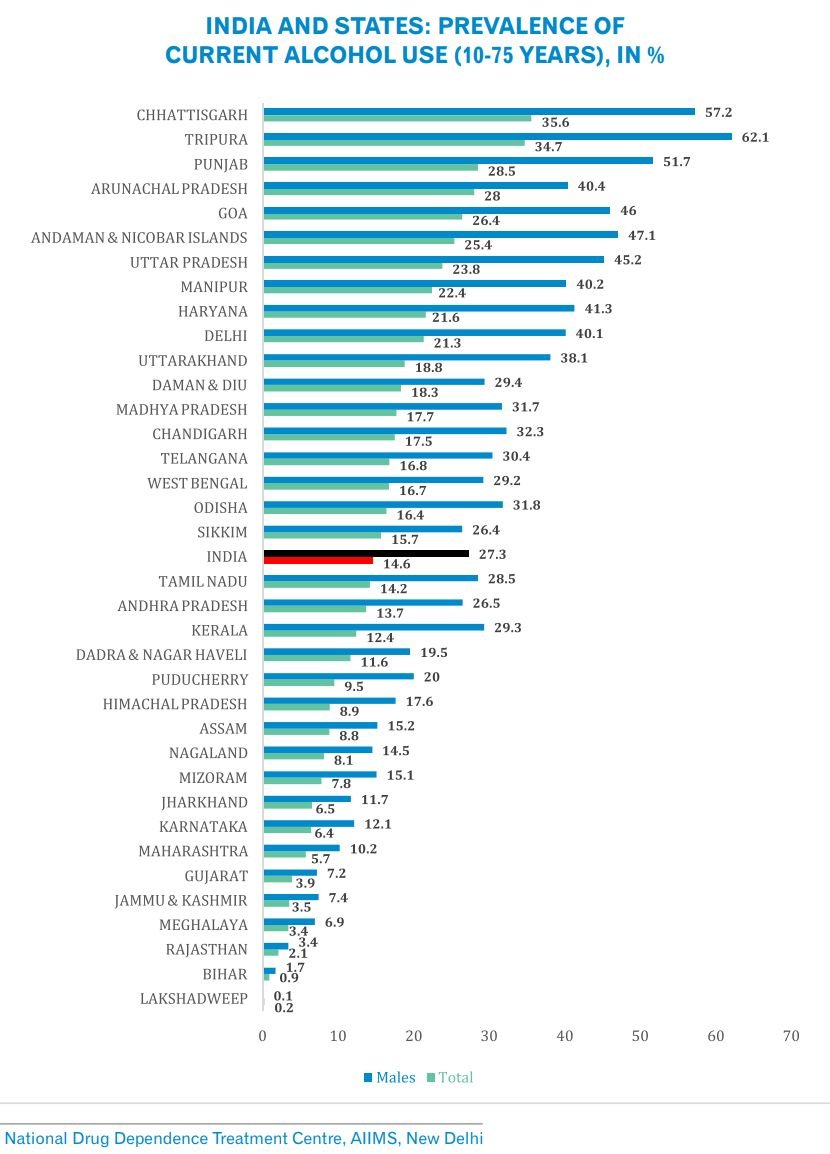 You can see alcohol use prevalence is lower than the national avg. in Kerala & it's below 20 other states in India including UP, MP, & HR (oops!) 6/
