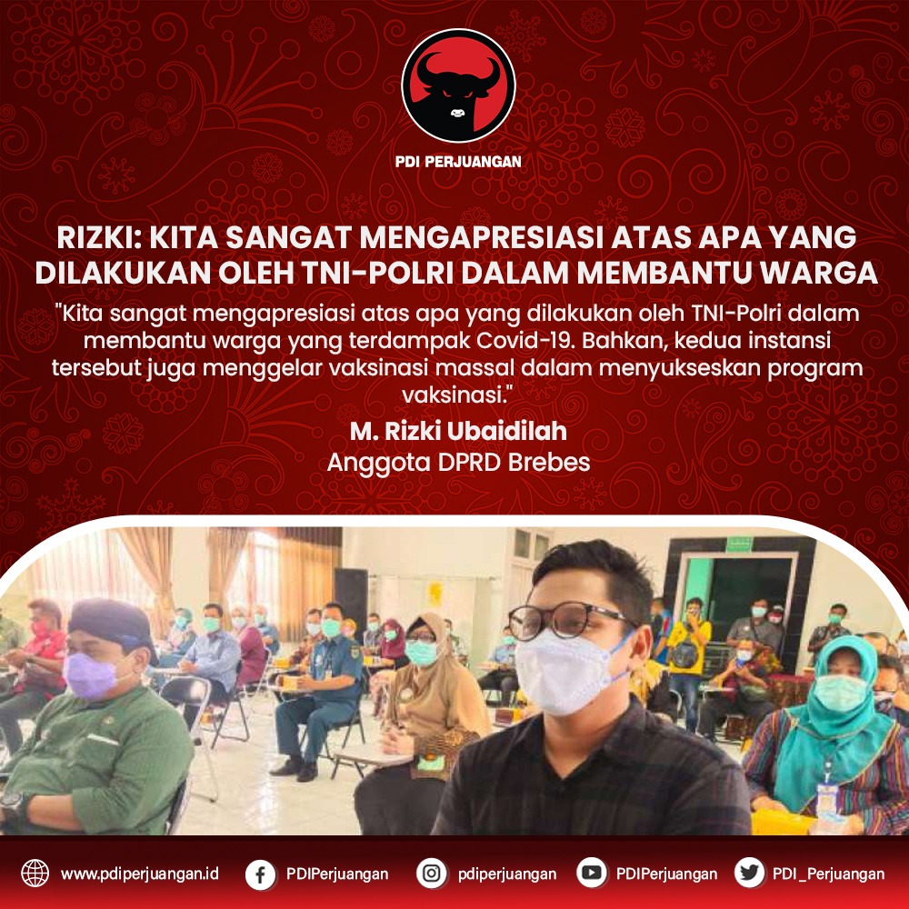 Baik itu pemberian sembako kepada warga yang terdampak Covid-19 maupun pelaksanaan vaksinasi massal. Atas dasar itu, Anggota DPRD Brebes, M. Rizki Ubaidilah mengapresiasi kinerja TNI-Polri yang terus memperhatikan masyarakat serta menyukseskan program vaksinasi.