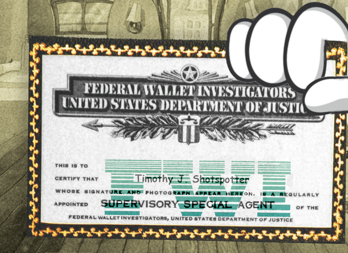 1/ A modified FBI badge. It now reads 'Federal Wallet Investigators.' It is made out to 'Timothy J Shotspotter.' It is held in the three-fingered, gloved grip of a cartoon character. Around its edges, we see a cartoon room from a public domain Betty Boop cartoon.