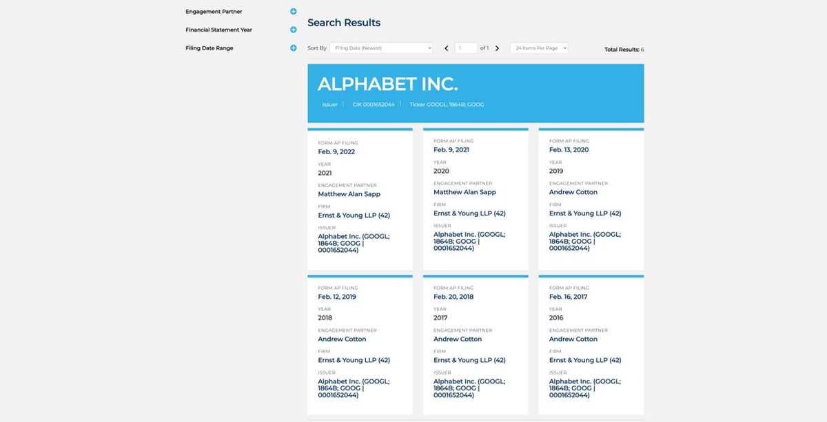 Al instante, obtenemos el histórico de firmas de auditoría, sus socios y las fechas de los informes de auditoría de Alphabet. Por ejemplo, podremos comprobar si han tenido muchos cambios de auditores durante los últimos años.