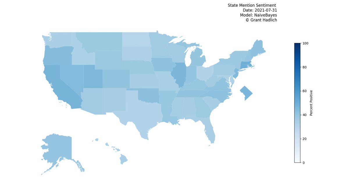 I analyzed the sentiment on Twitter for each state + DC from the last week using a #NaiveBayes model from #NLTK.