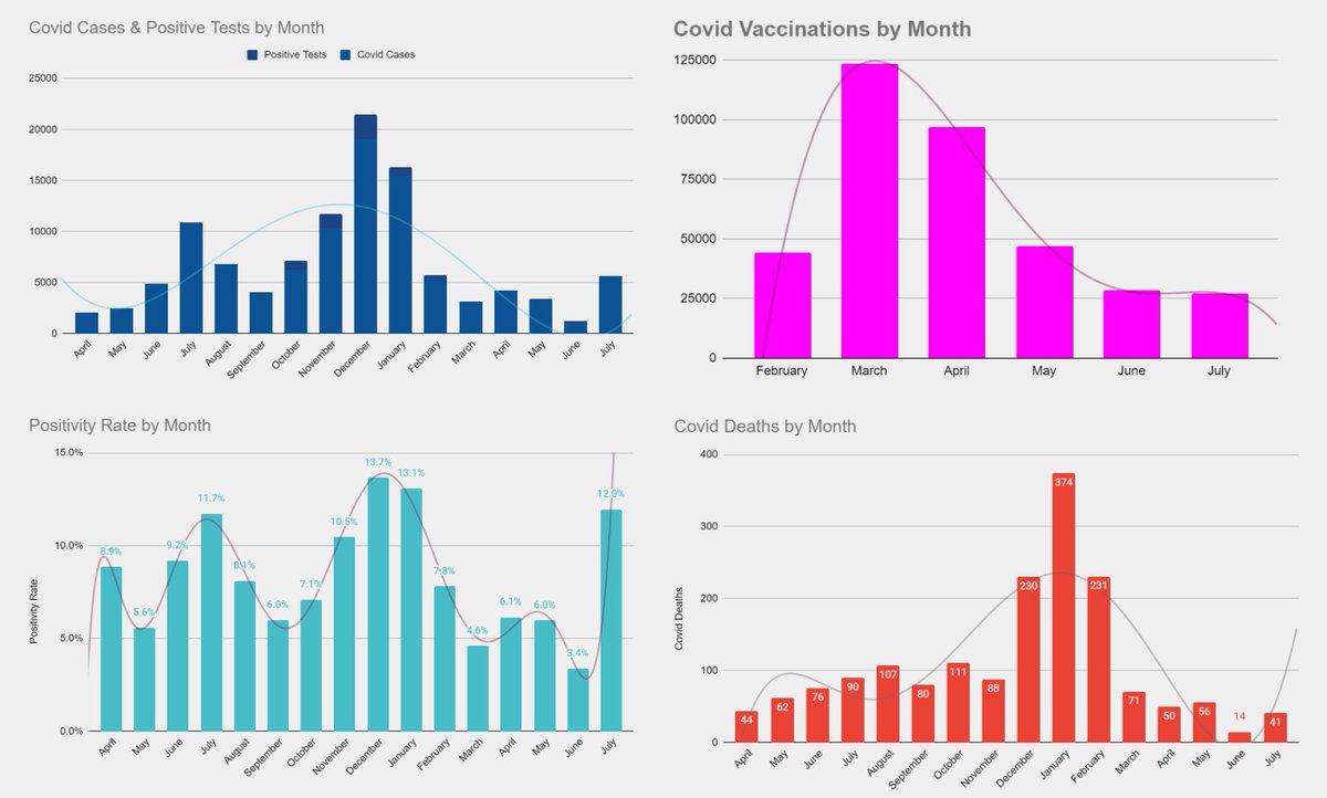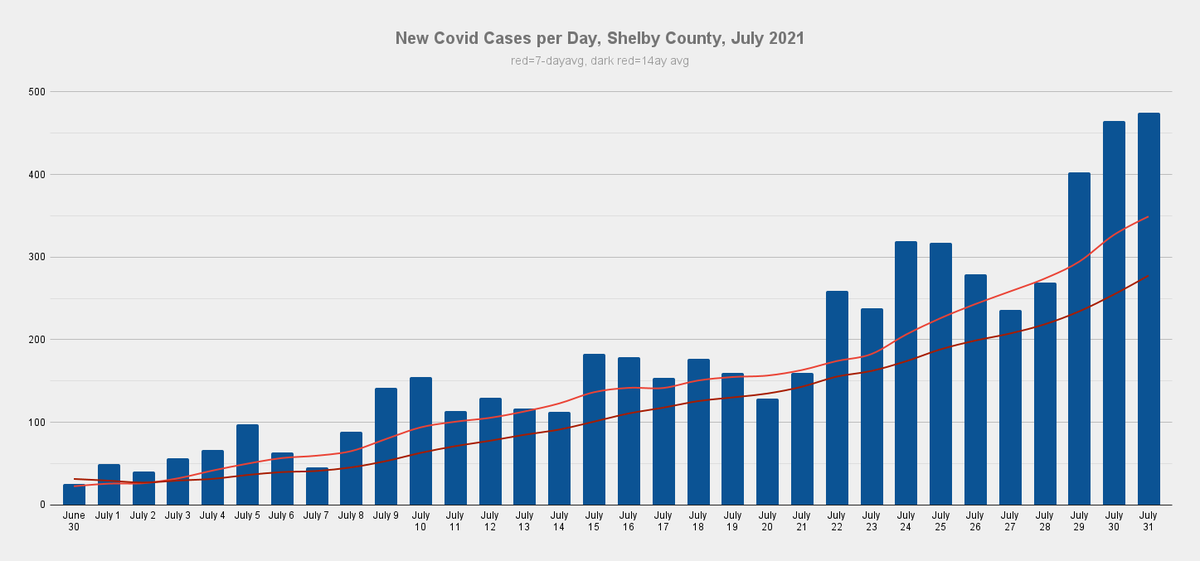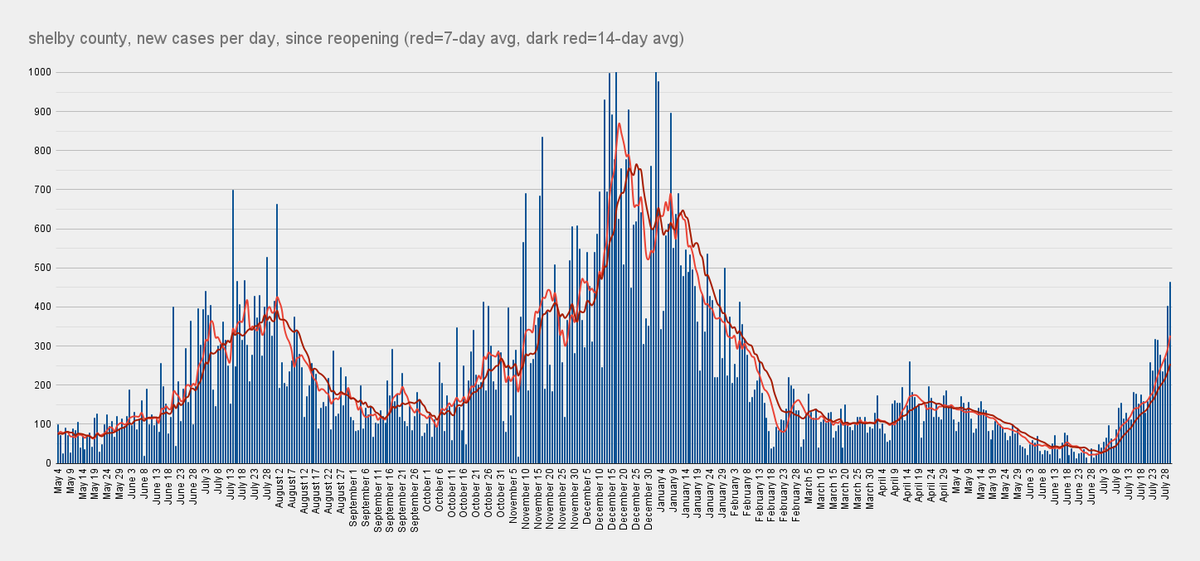 We were avg'ing 22 new cases/day on June 30. Today, July 31, we're up to 349/day.