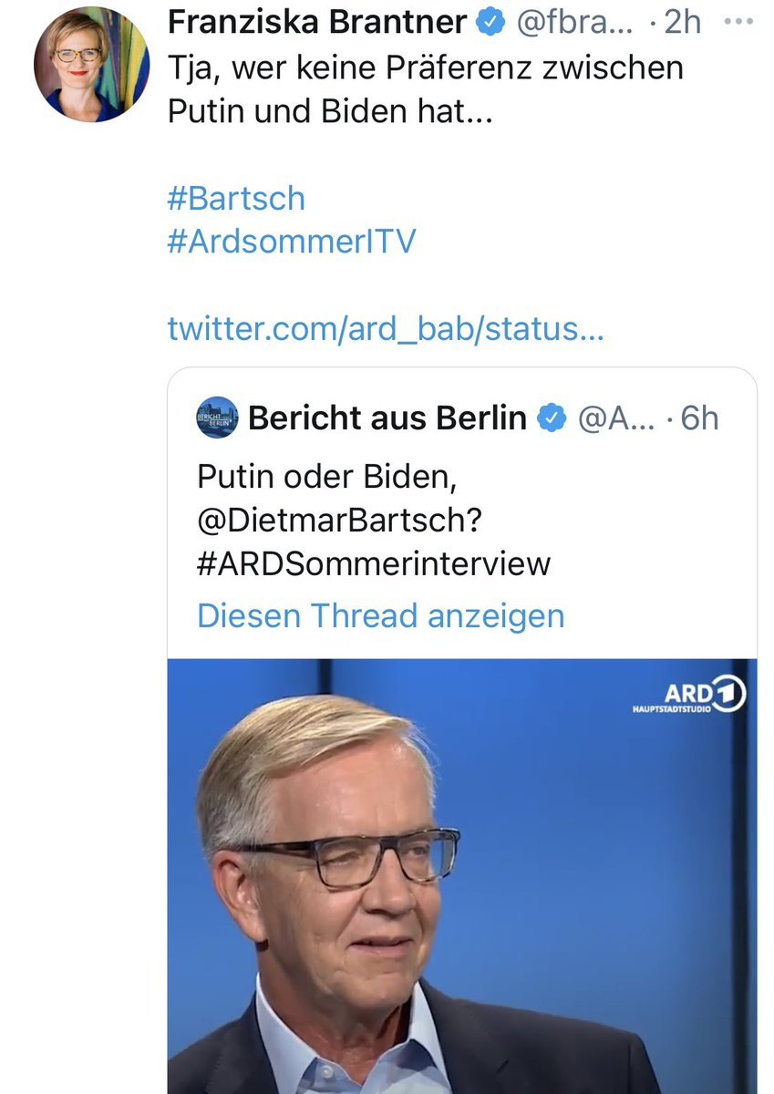 Ach nein, wie süß. Alle sind jetzt voll verärgert darüber, wie Bartsch nicht wie aus der Pistole geschossen „Biden“ rufen konnte. Oh man. Ein Armutszeugnis. Wie Leute wieder beweisen, dass sie nicht annähernd wissen, wofür Kriegstreiber bzw. - Verbrecher Biden steht. #dEmoKRaTiE