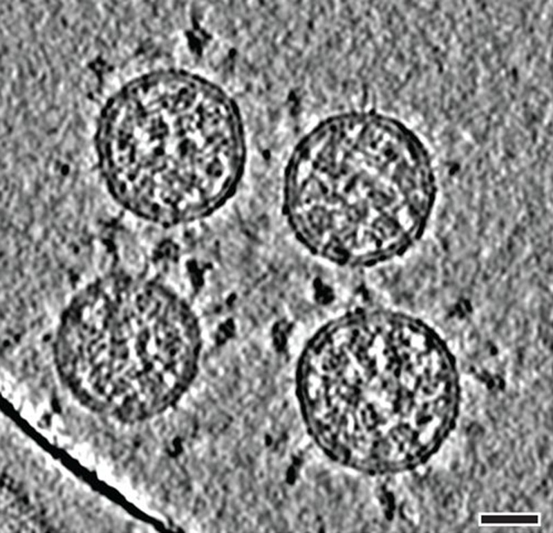 4/Once virus RNA genome is in the cell, the human cellular machinery translates the RNA into proteins that assemble together and give rise to new viruses that go on to infect other cells. This is a cross section image of SARS-CoV-2 viruses/virions