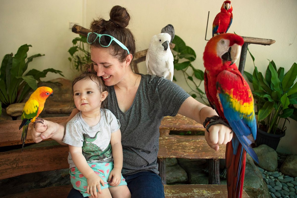 Image ALT TEXT: Curator with her daughter sitting on a bench with three parrots perched on her arms.