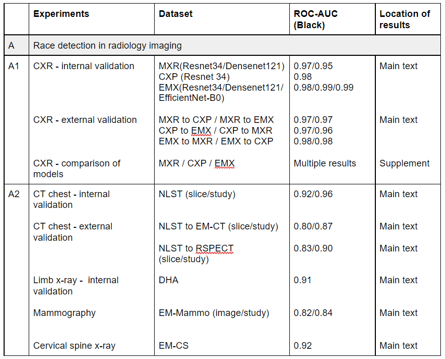 Humans can't detect race better than chance, but AI performs absurdly well on the task. As you can see here, AUC scores are in the high 90s, and are maintained on external validation on completely distinct datasets and across multiple different imaging tasks.