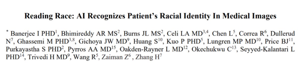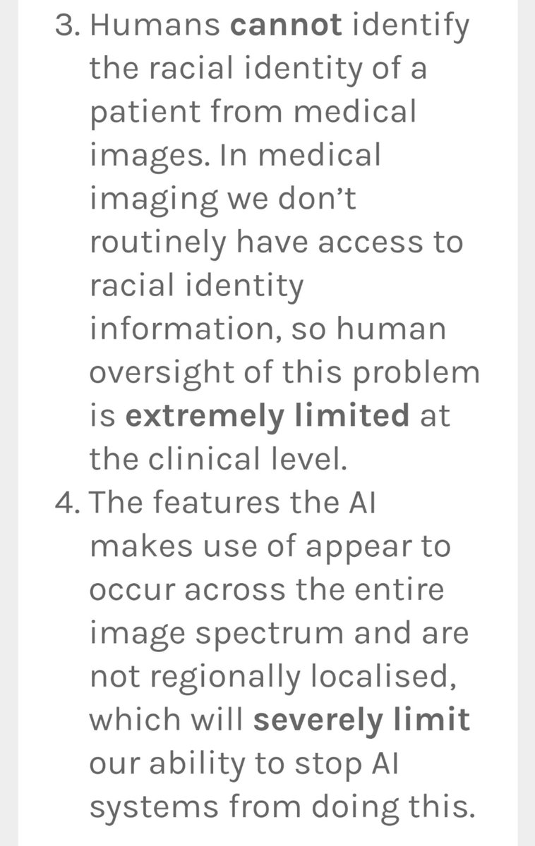 We've put out a preprint reporting concerning findings. AI can do something humans can't: recognise the self-reported race of patients on x-rays. This gives AI a path to produce health disparities.