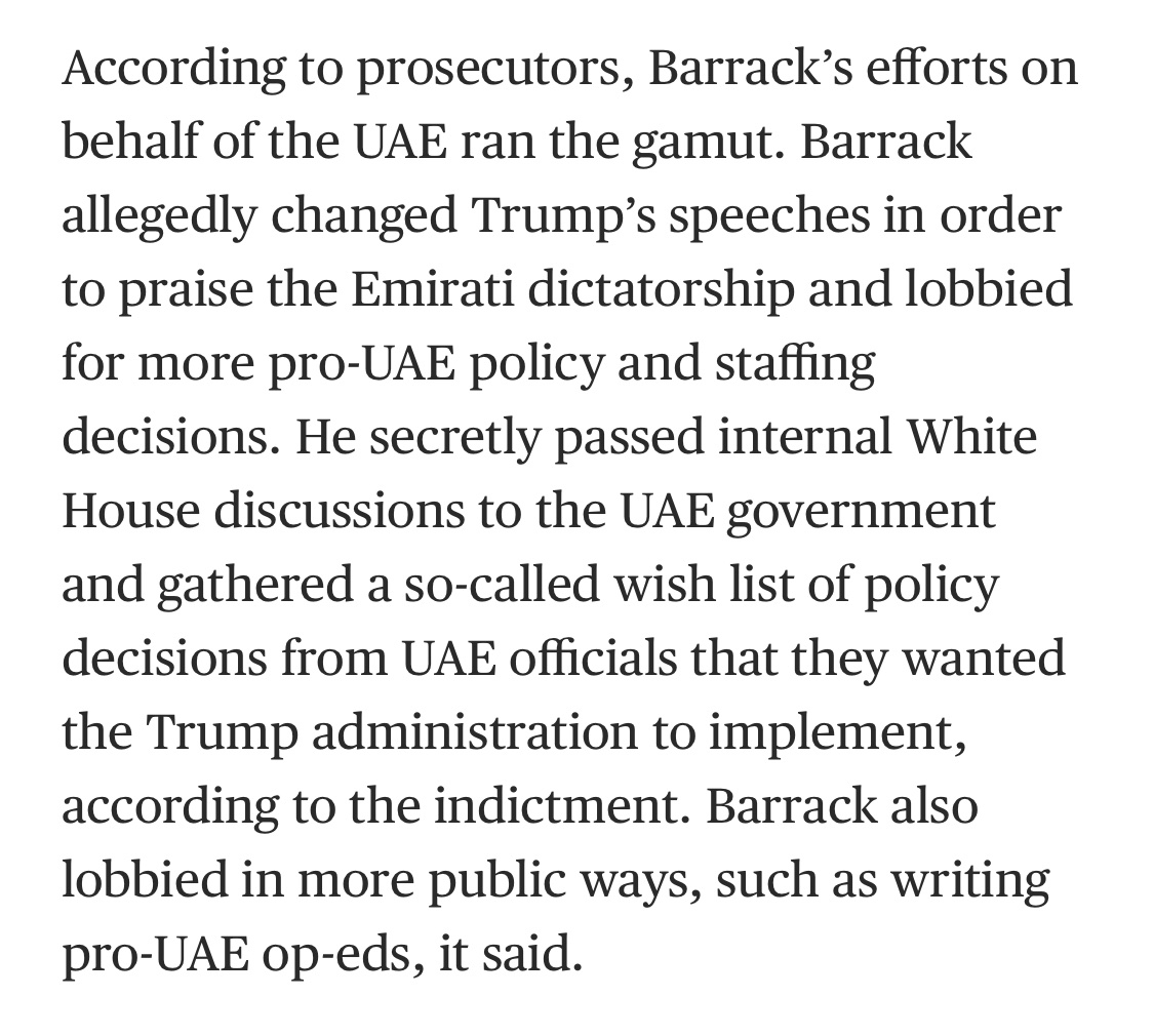 Just look at what Tom Barrack—Trump’s close friend, advisor, fundraiser—allegedly did secretly on behalf of the UAE dictatorship: