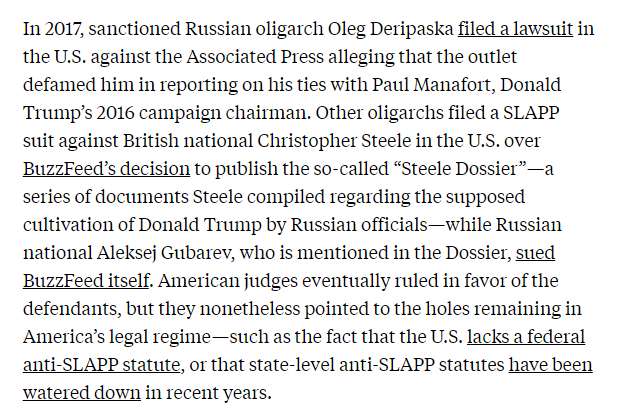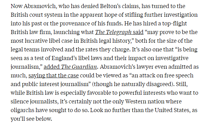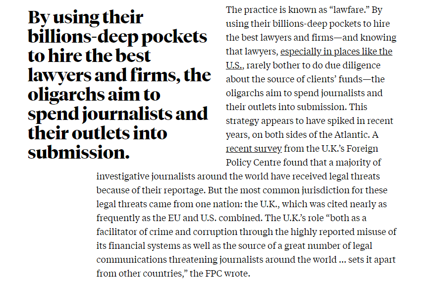NEW: A series of lawsuits from Russian oligarchs in the UK highlights how easy it is for kleptocratic forces to stifle Western journalists, and anyone trying to shine a light on international money laundering networks. newrepublic.com/article/163131…