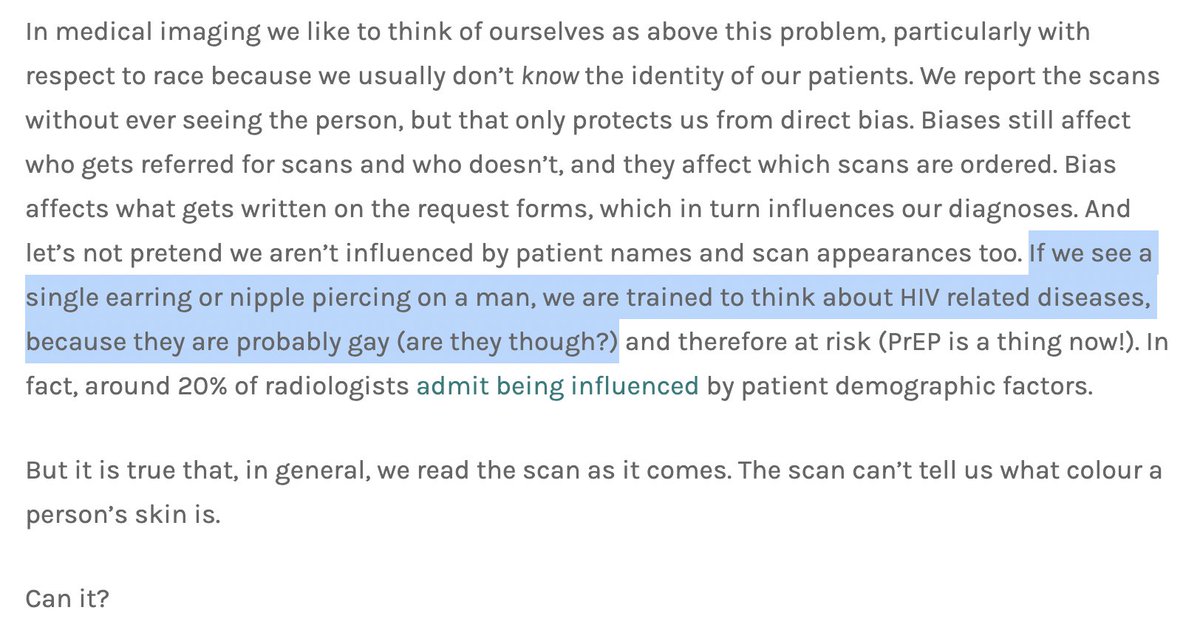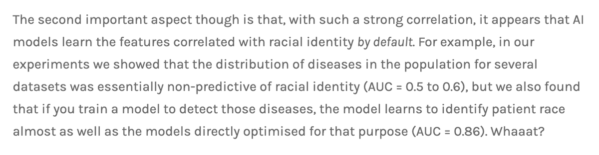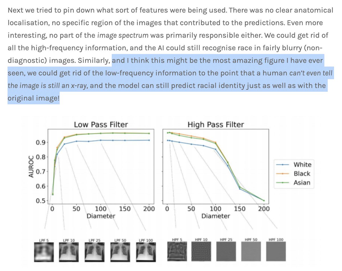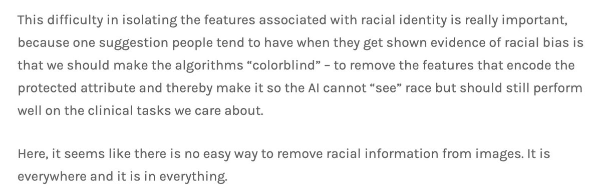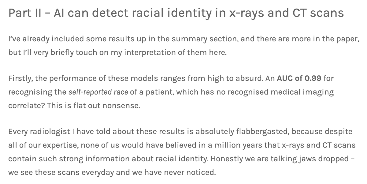 His writeup on this is truly incredible. Imagine creating an AI that can predict a person's racial background with almost perfect accuracy from just a few scans and assuming this must be an error of a biased AI instead of your own ideology