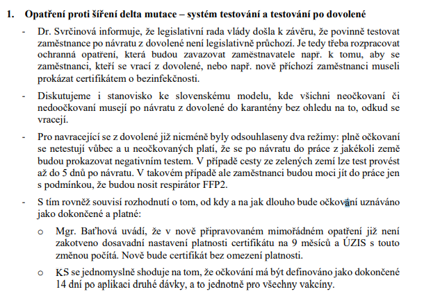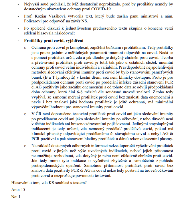 3) Vyjádření KS COVID k stanovisku Nejvyššího soudu k protilátkám 4) Problematika postcovid a longcovid 5) Zkrácení intervalu očkování 6) Interpelace: Povinné očkování personálu v sociálních a