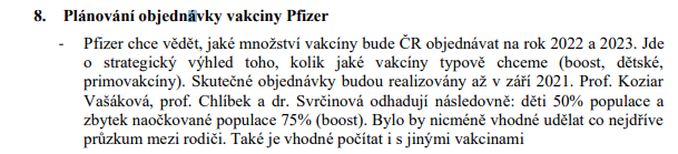7) Zpožděné hlášení výsledků antigenních a PCR testů na covid 8) Plánování objednávky vakciny Pfizer - Pfizer chce vědět, jaké množství vakcíny bude ČR objednávat na rok 2022 a 2023. 9) Různé - jak oslovit neočkované >60 let? Očkování bez registrace.